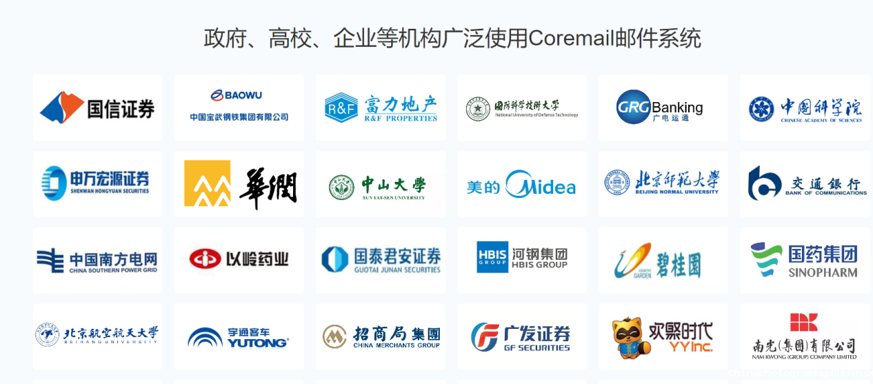 Coremail自2021年正式成立邮件安全事业部,专注于一站式解决所有邮件安全问题,产品涵盖邮件安全网关、CAC2.0反钓鱼防盗号、安全海外中继、重保服务、反钓鱼演练等。客户涵盖国务院新闻办公室、国家科技部、国家财政部、中科院、清华大学、北京大学、人民银行、建设银行、交通银行、华润集团、南方电网、美的集团等。