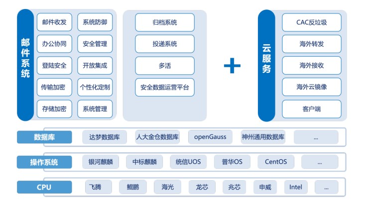 进入信息化时代,信息安全逐渐被重视,近年来,信创建设稳步推进。根据2+8+n的部署策略,金融行业作为国家安全的重要组成部分,率先进行信创改造。作为邮件行业排头兵,Coremail紧跟国家战略方针,发挥自身优势,研发中心资源向信创项目全面倾斜,全力适配信创目录内的CPU、操作系统、数据库、中间件等产品,满足信创客户的应用需求。