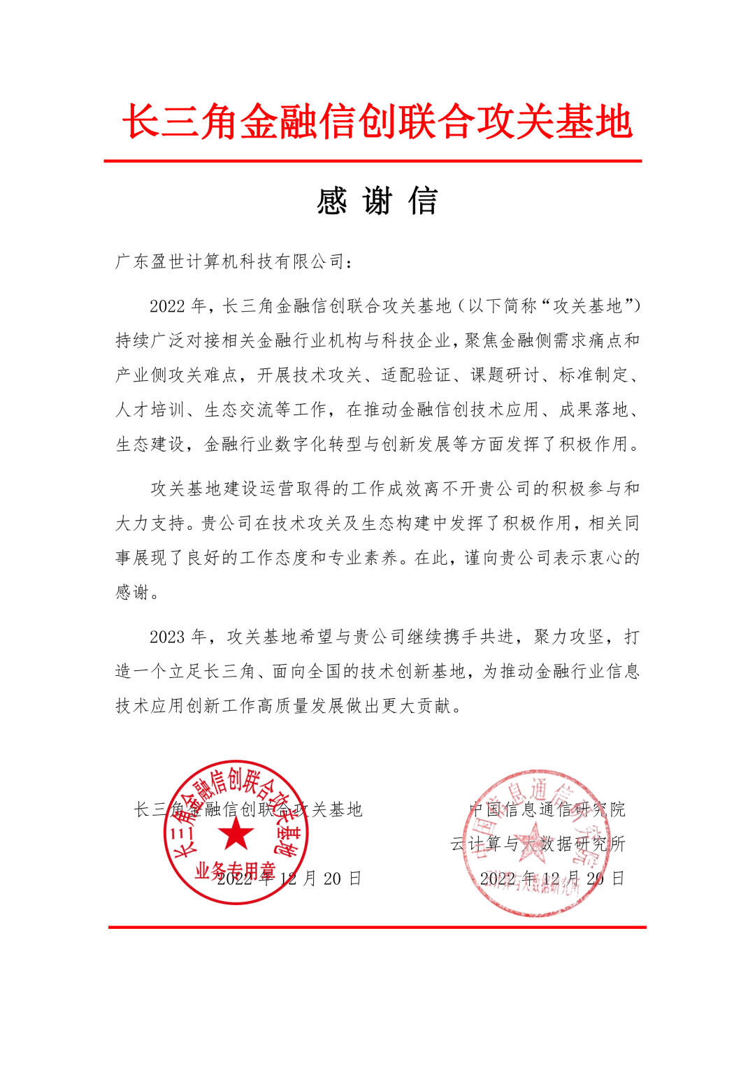 长三角金融信创联合攻关基地《感谢信》