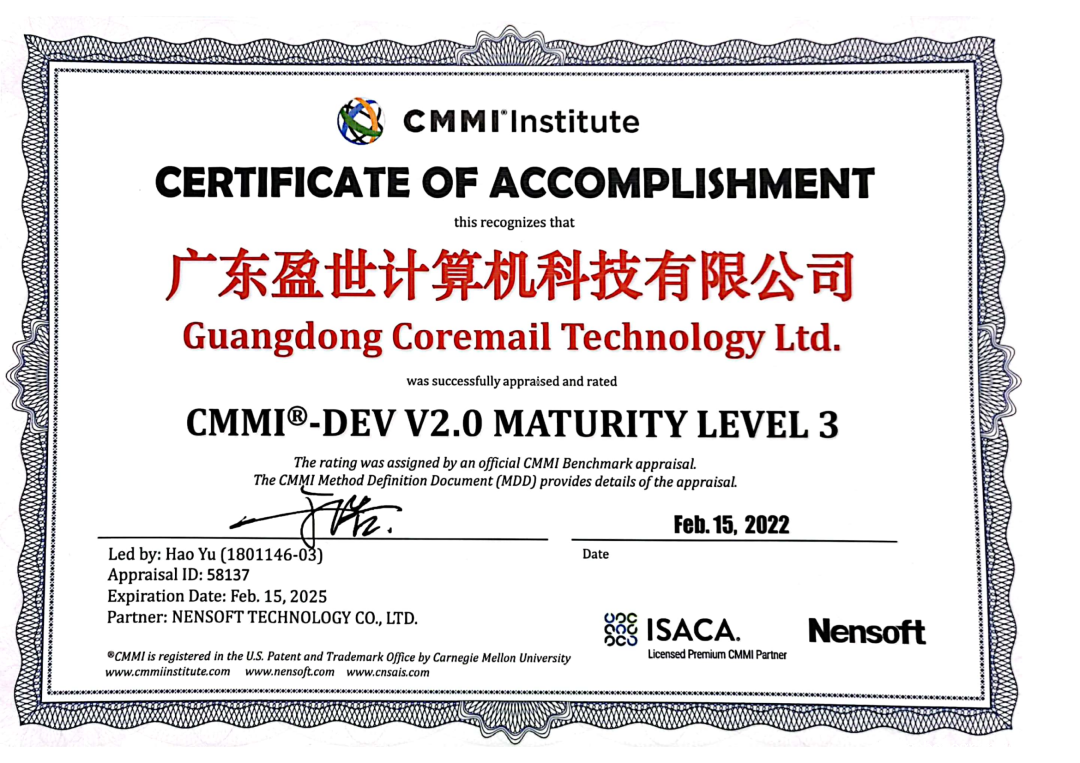 2022年2月,雷竞技注册平台被授予CMMI 3级证书。CMMI全称为Capability Maturity Model Integration,即软件能力成熟度模型集成,是国际公认的衡量软件企业业务能力成熟度和项目管理水平的权威标准,主要用于指导软件开发过程的改进和进行软件开发能力的评估,是目前全球范围内软件领域难度最大、规格最高、最权威的认证之一。