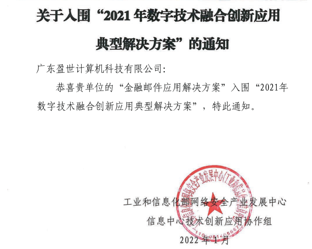 2022年1月,Coremail金融邮件应用解决方案成功入围由工业和信息化部网络安全产业发展中心(工业和信息化部信息中心)、信息中心技术创新应用协作组主办的“2021年数字技术融合创新应用典型解决方案”