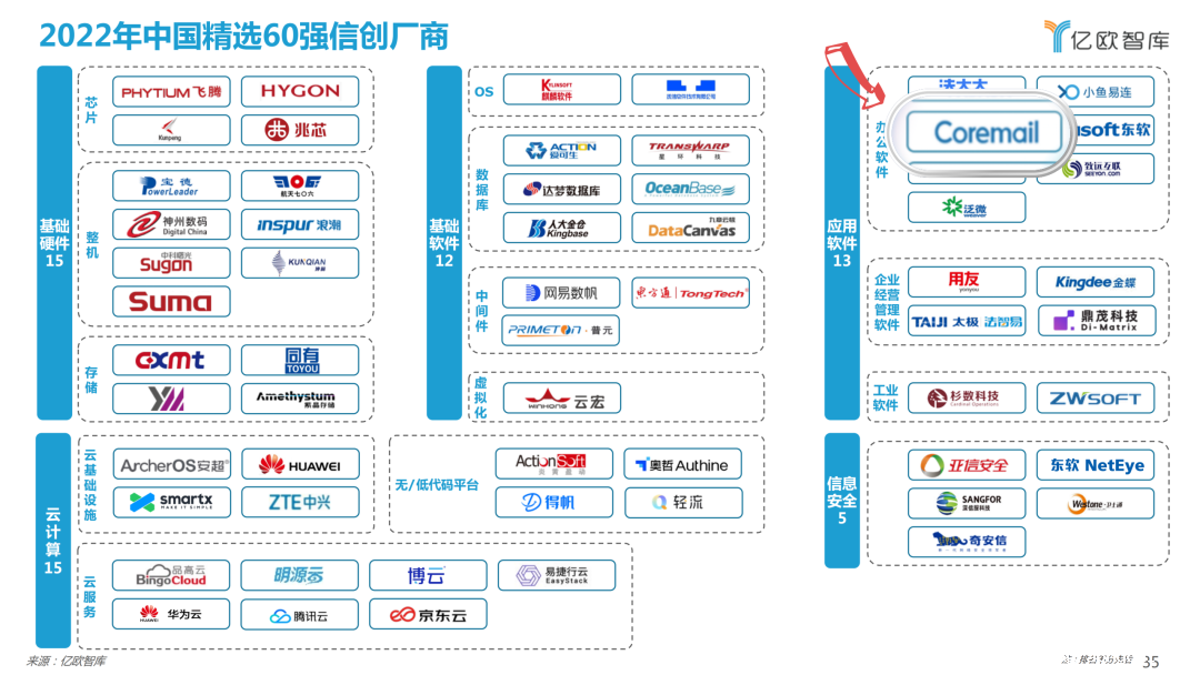2022年12月,亿欧智库重磅发布《2022 中国信创产业竞争力研究报告及精选60强信创厂商》,对中国信创产业发展现状、核心竞争力以及信创产业未来发展趋势进行深度分析。Coremail凭借23年积累的技术优势和丰富的信创实践经验,成功入选其“60强信创厂商”,也是本次唯一入选的邮件领域厂商。